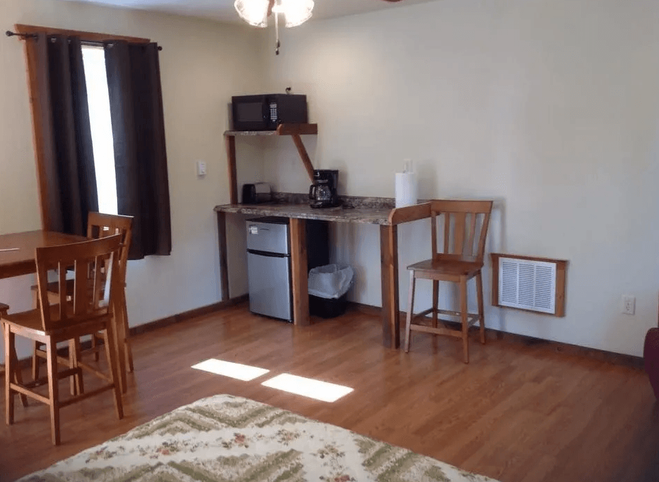 Apartment-Sized Refrigerator, Microwave, Coffee Maker and Toaster, Table and Chairs (dining or gaming)